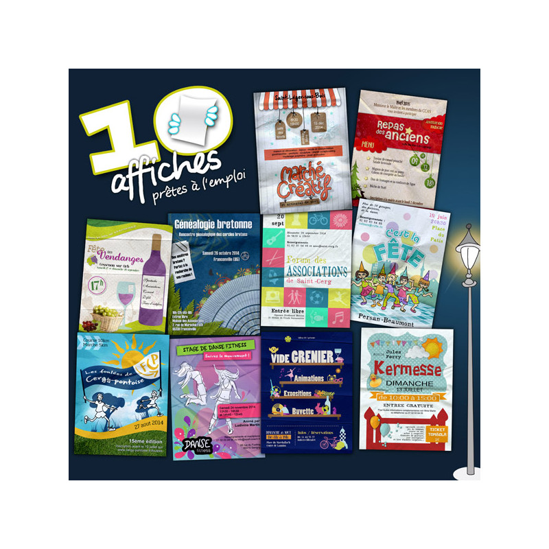 Retrouvez 10 nouvelles affiches dans ce pack. Pile dans la tendance des affiches graphiques du moment, elles constituent des modèles entièrement personnalisables, que vous pourrez modifier au gré de vos besoins. Pour les événements associatifs, la vie scolaire, les besoins de la commune, etc...